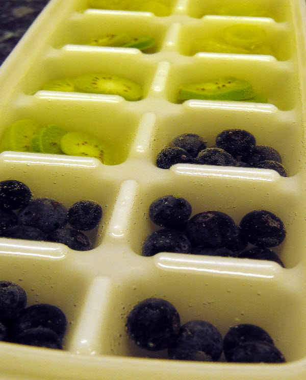 One afternoon, I had a nearly-flat bottle of lemonade and a few blueberries left behind by my ravenous teenage boys. Before they vanished entirely, I decided to pop them into ice cube trays with a splash of the remaining soda. I also had a handful of mini kiwifruit (the size of cherry tomatoes) that I’d been given to try. Into the trays they went too.